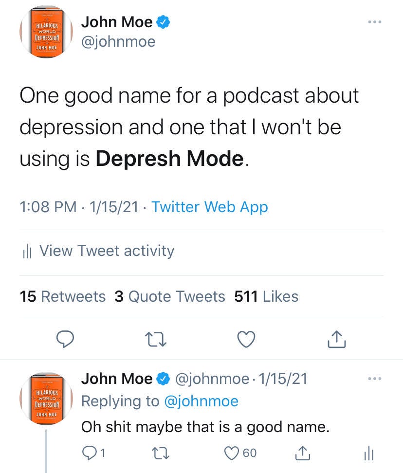 Depresh Mode with John Moe debuts on March 29th. It’s an interview-based show about common mental health disorders such as depression, anxiety, trauma, panic, and others. It’s made in partnership with the company Maximum Fun, which is a company built on creators like me having ownership of what they make so I own Depresh Mode.