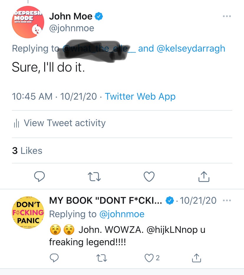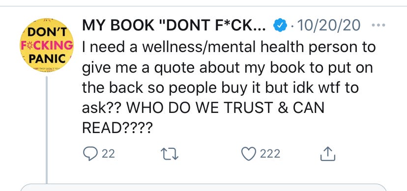 A Twitterer, who has since deleted the tweet, suggested me. So I saw that and read up on Kelsey and found that she was loud, funny, and honest in writing about mental health. I think I often get along with the loud because they fascinate me. So…