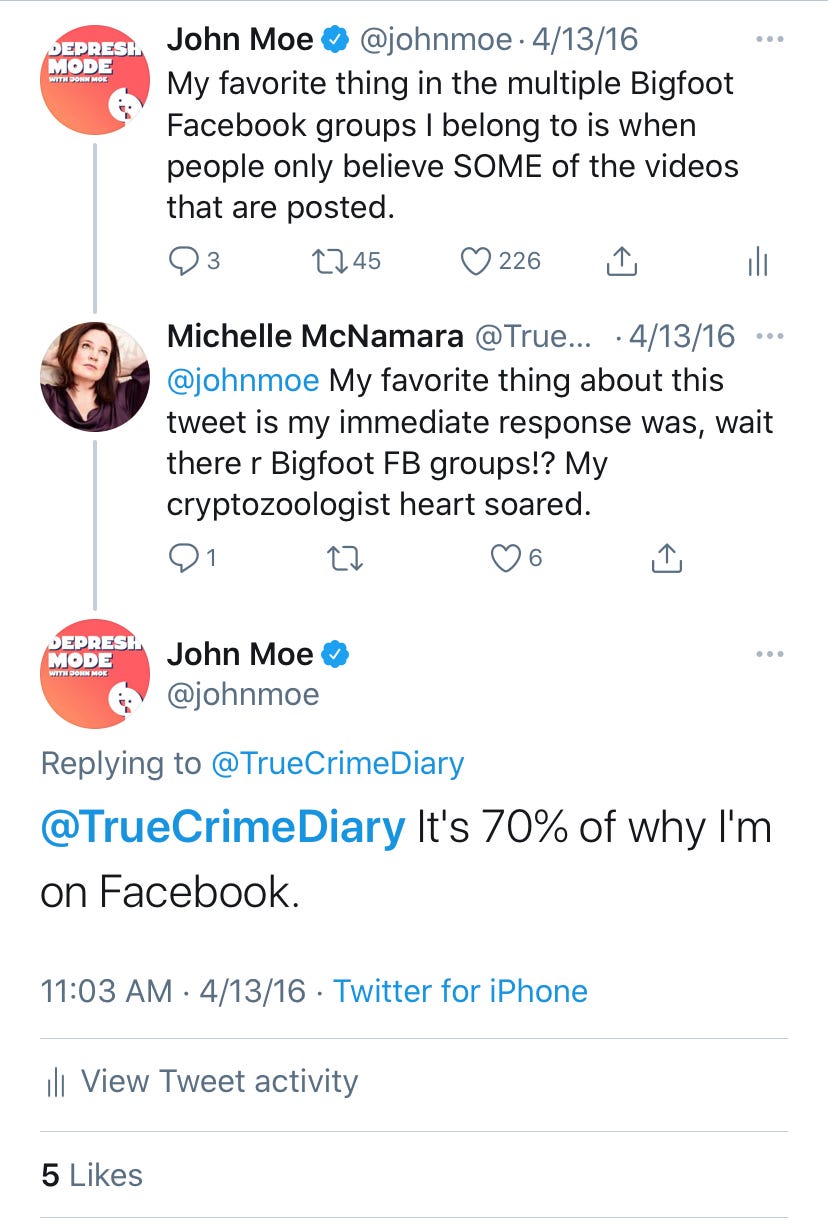 As I explained in the show, having Patton on first was the goal of the previous podcast I hosted. He has been talking about depression, loudly, clearly, and humanely for many years. But between the time we did that interview and the show premiered, Patton’s wife, Michelle McNamara, died. I knew that the interview I had done wouldn’t reflect who Patton was in the present. Listeners would feel like we were avoiding a big topic. So we never used the tape.